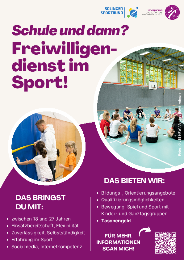 Die Freiwilligendienste im Sport sind ein Bildungs- und Orientierungsjahr und fördern freiwilliges gesellschaftliches Engagement. Du erhältst Einblicke in die Berufsfelder rund um den Sport in Solingen z.B. beim Solinger Sportbund oder in den Sportvereinen. Die Einsatzbereiche sind hier so vielfältig wie der Sport selbst!